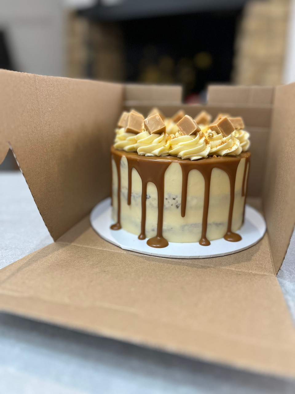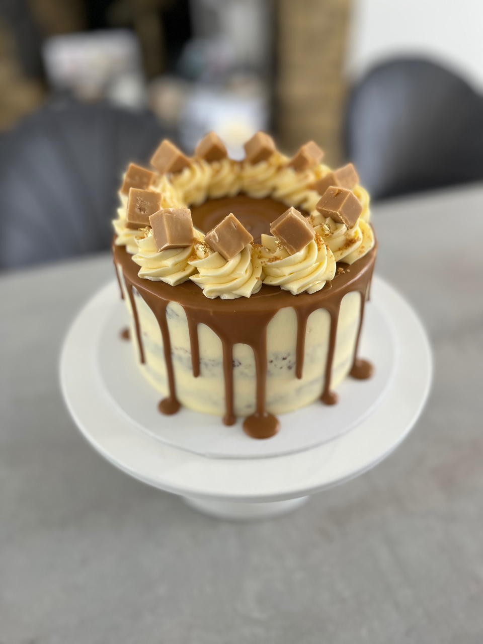 Sticky toffee sponge layered between vanilla bean buttercream and salted caramel. Finished with a naked ice, biscoff drip and fudge pieces.  Allow 5 working days for us to process your order. Picture shown is our 6inch shallow cake.